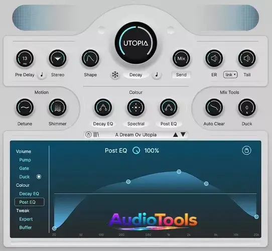 Utopia is more than a simple reverb; it functions as a potent compositional and harmonic resource featuring a groundbreaking spectral processing engine. Its distinctive algorithm carefully monitors and alters harmonic elements instantly, providing a wide range of parameters and an unmatched degree of control. Utopia merges enhanced control with a user-friendly interface and numerous presets for interactive exploration. Utilize the color section to seamlessly move from flat to colored reverb responses. This singular, sleek adjustment influences decay, spectral traits, and post EQ. Next, shape the onset and initial decay of the reverb using the Shape section. Every shape preset provides a distinct arrangement for swells, fades, and sustain.